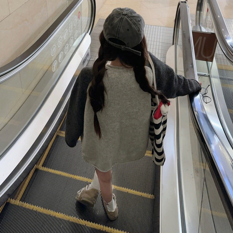Strickjacke mit geradem Schnitt und durchgehender Knopfleiste auf der Vorderseite. Das Modell verfügt über einen runden Ausschnitt, lange Ärmel in kontrastierendem Strick und eine strukturierte Oberfläche. Die Vorderseite ist mit mehreren Knöpfen geschlossen und der Saum endet in einer abgerundeten Form.