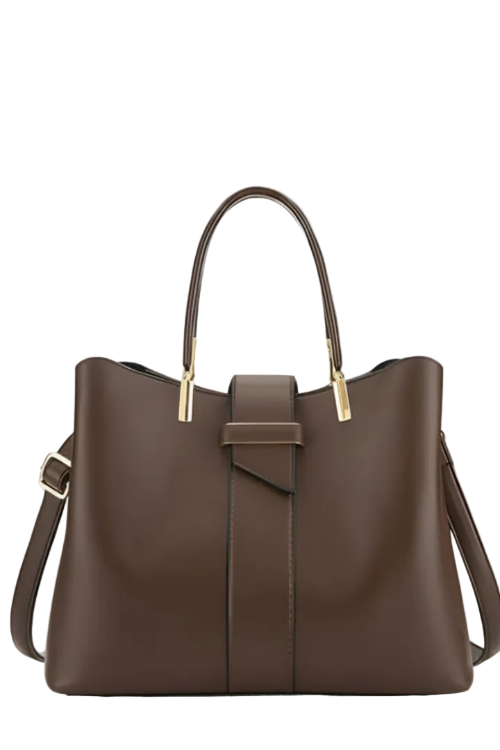 Diese Tragetasche hat eine strukturierte Silhouette mit zwei oberen Griffen und einem abnehmbaren Schulterriemen. Das Design umfasst eine glatte Außenfläche mit einem zentralen vertikalen Riemendetail und einem vorderen Verschlusselement sowie Metallteile an den Griffbefestigungen.