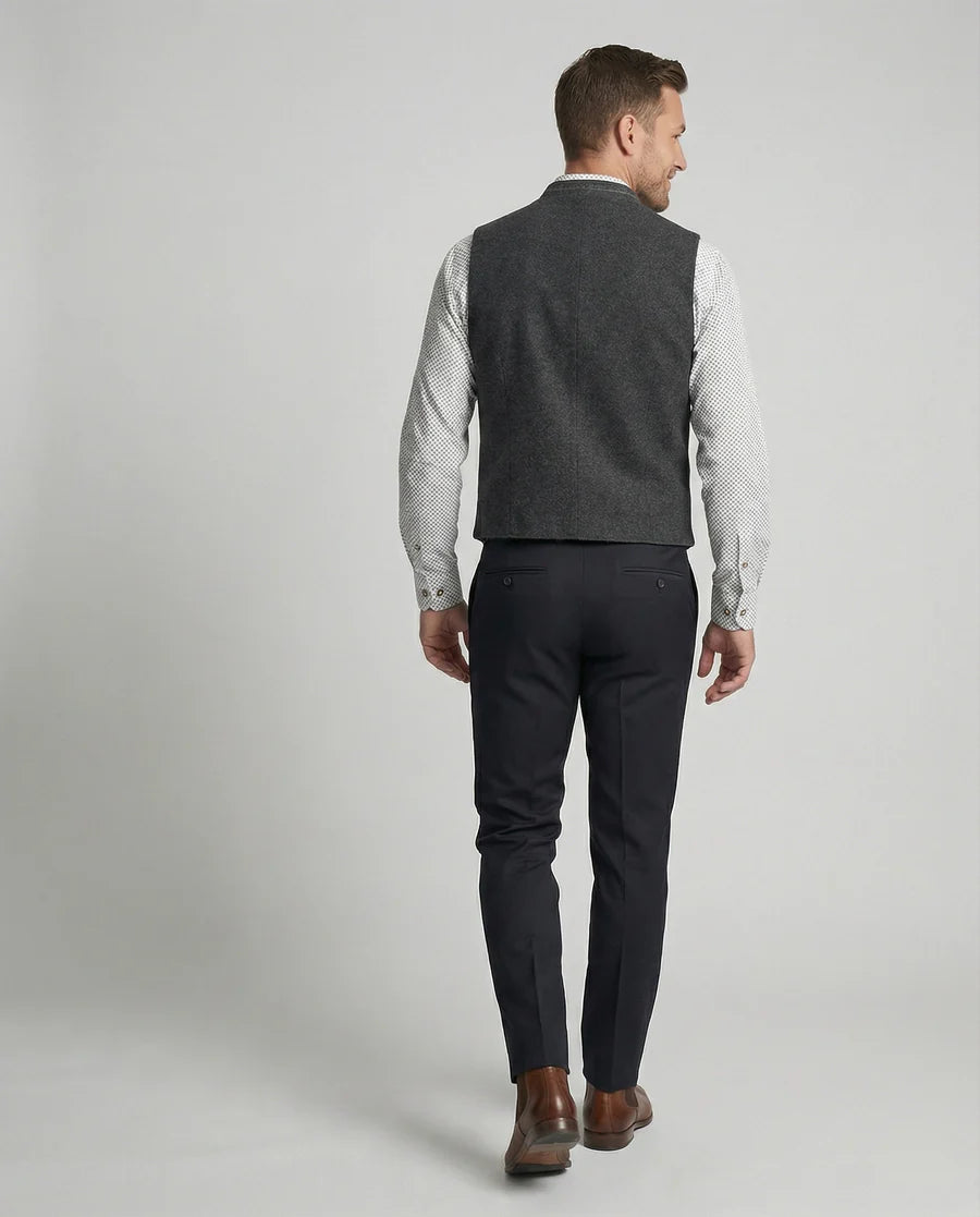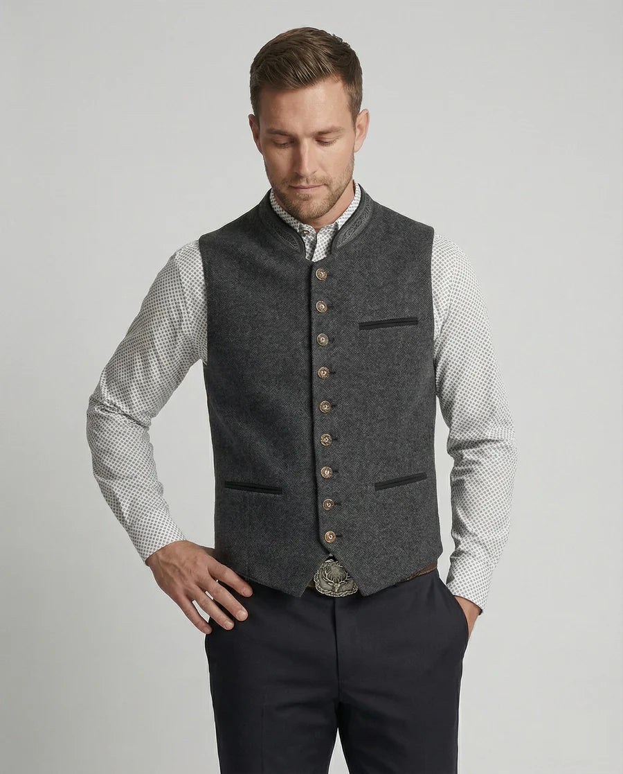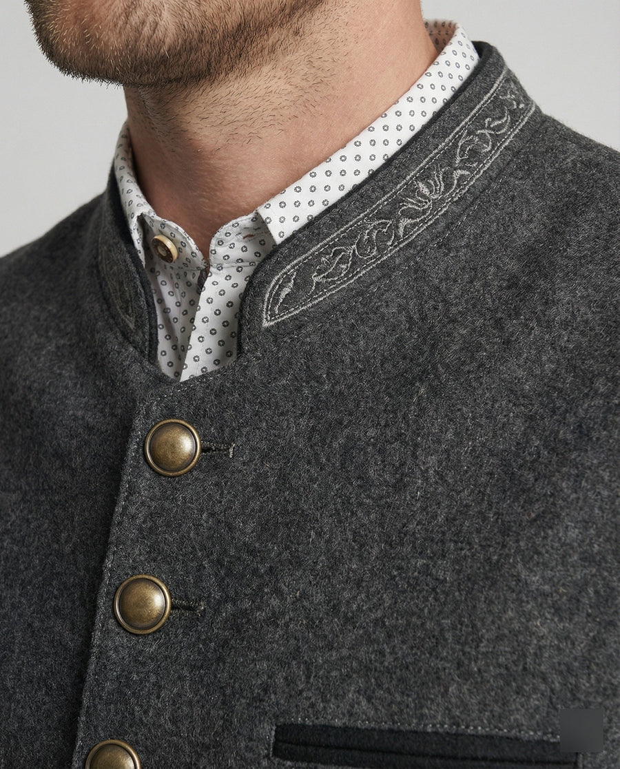 Diese Herrenweste besitzt eine gerade geschnittene Form mit spitz zulaufendem Vorderabschluss. Der Stehkragen ist entlang der Kante mit dekorativer Stickerei versehen. Eine durchgehende Knopfleiste mit gleichmäßig angeordneten Metallknöpfen verläuft mittig auf der Vorderseite. Auf der Front befinden sich eine Brustleistentasche sowie zwei untere Leistentaschen mit kontrastierender Einfassung.